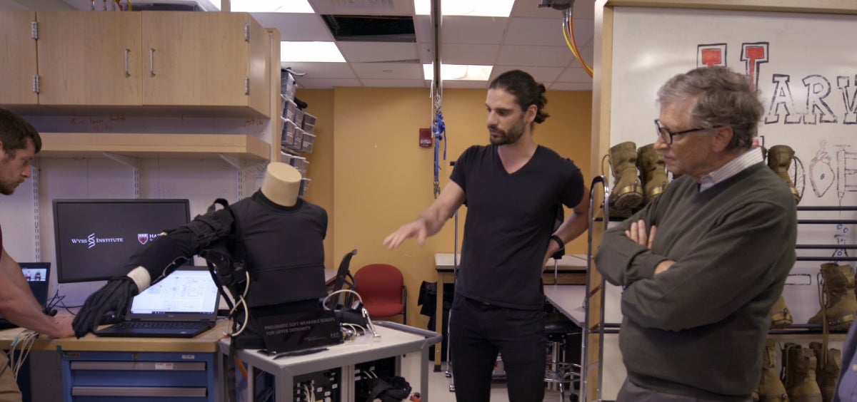 Stepping inside of the lab of Dr. Conor Walsh, founder of Harvard’s Biodesign Lab, I met a researcher wearing a pair of robotic britches walking on a treadmill. The britches are part of an exosuit developed by Conor and his team to help restore movement for people with spinal cord injuries or movement disorders due to a stroke or disease. And for healthy people, the exosuits could help ease the physical burdens experienced by firefighters, factory workers, and soldiers.