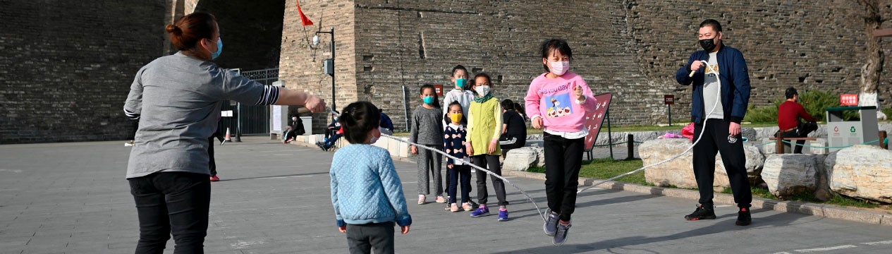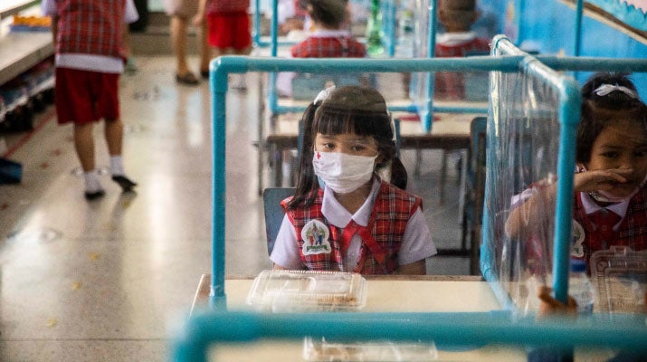 (Above) Kindergarteners wear masks in Bangkok, Thailand. (Lauren DeCicca/Getty Images) (Below) Another day, another virtual meeting.