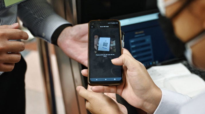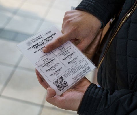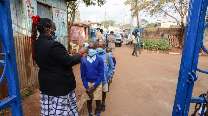 (Above) A woman shows her proof of vaccination document in Mexico. (Paul Ratje/Getty Images) (Below) A teacher in Nairobi, Kenya, checks her students’ temperatures before class starts. (SOPA Images/Getty Images)