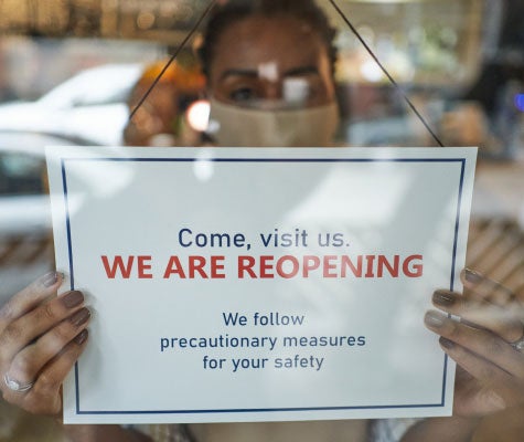 A barista announces the reopening of her coffee shop. (Getty Images)