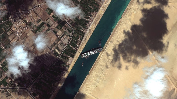 A large cargo ship became lodged in the Suez Canal, halting global commerce for six days in March. (Satellite image 2021 Maxar Technologies/Getty)
