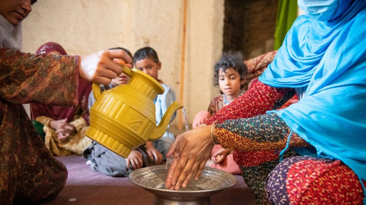 A community health worker speaks with families about COVID-19 prevention in Afghanistan.