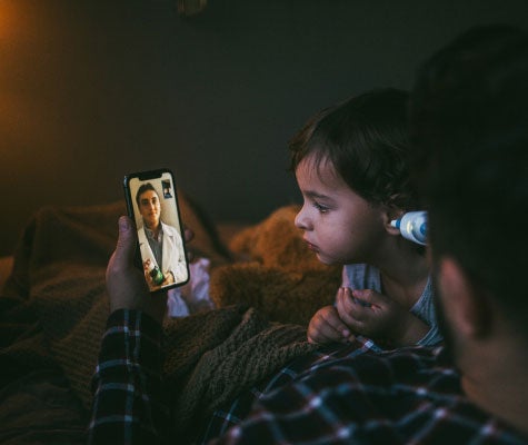 A dad checks his daughter’s temperature while a doctor watches over a video call. (Maskat/Getty Images)