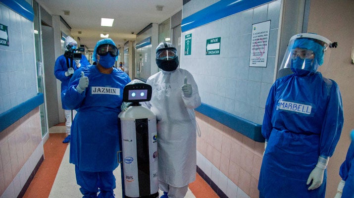 Health workers pose with a robot that helps with consultations, therapies, and mental health evaluations of COVID-19 patients. (Claudio Crus/Getty Images)